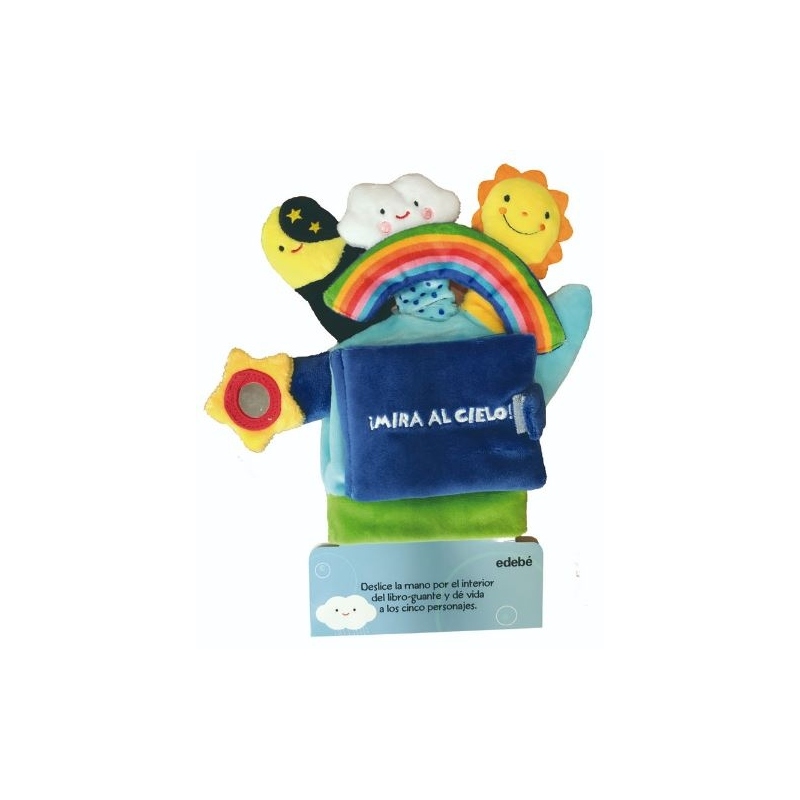 Libro guante de tela. Cada dedo es un títere relacionado con el cielo: el arcoíris, el sol, la nube, la luna y la estrella. Al igual que todos los libros guantes de la colección, las ilustraciones son de colores intensos y van acompañadas de un sencillo texto.